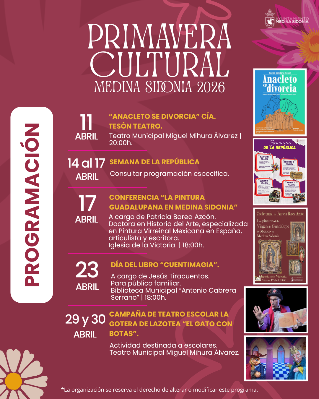 La Concejalía de Cultura del Ayuntamiento de Medina Sidonia presenta la Programación Cultural de Primavera, una agenda pensada para seguir llenando nuestro municipio de cultura, arte y actividades para todos los públicos.